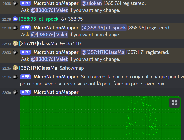 no external libraries JS/HTML/CSS Solo workMade for the Dibistan micronation social experiment. The bot was meant to map the discord people's locations, as they joined a discord over time, which was then turned into a gif. Each little green dot represents an active member. I then turned it into casino minigame bot.